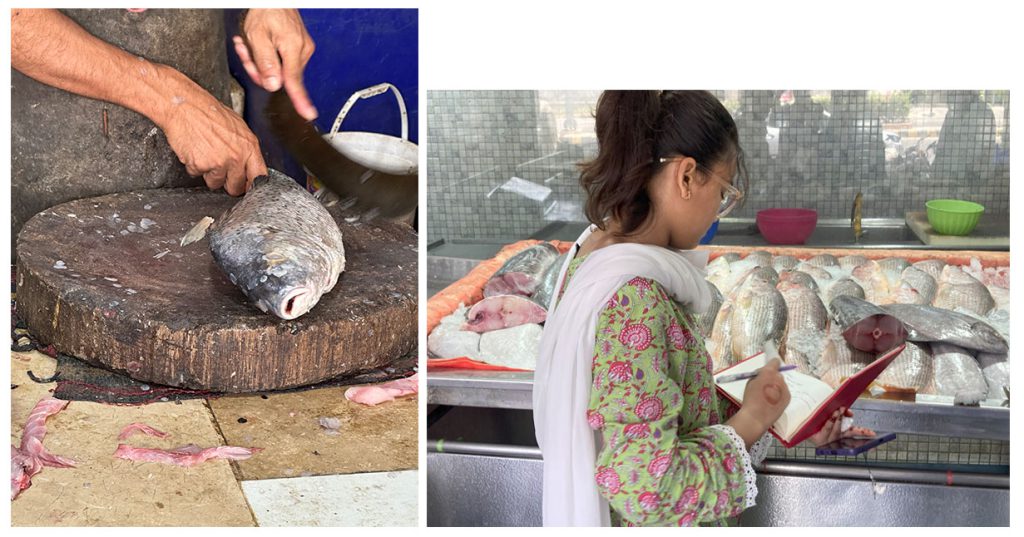 For the duration of two and a half months in 2025, the URA organized an internship program with students from the Department of Fine Art at IVS. A recurring activity of the internship was to collect data and surveys of the various fish markets in Karachi. The intention behind asking art students to learn about fish species through their anatomical differences with fishermen at the bazaar, who are involved in deboning/deveining, cleaning and filleting of seafood, is to learn through the cycle of consumption and preparation how our fishing economy works directly through its stakeholders. This field research has allowed the URA and our students to have a better grasp of the biology of fish and crustacea, the technical requirements of fishermen and how mass development, migration, climate change and overfishing is affecting Karachi’s seafood economy. The field research aspect under the Machi Qaida project, was designed out of both curiosity and concern; First, that fish is not a popular food choice among the citizens of Karachi, despite the city’s close proximity to the sea. Second, that in recent years there has been a notable rise in malpractices within the export of fish, including large international trawlers posing a serious threat to the seabed through destructive fishing methods, as well as fishing during off-seasons. Through fieldwork, the URA was able to understand the complexity of these issues and find ways to creatively address them.