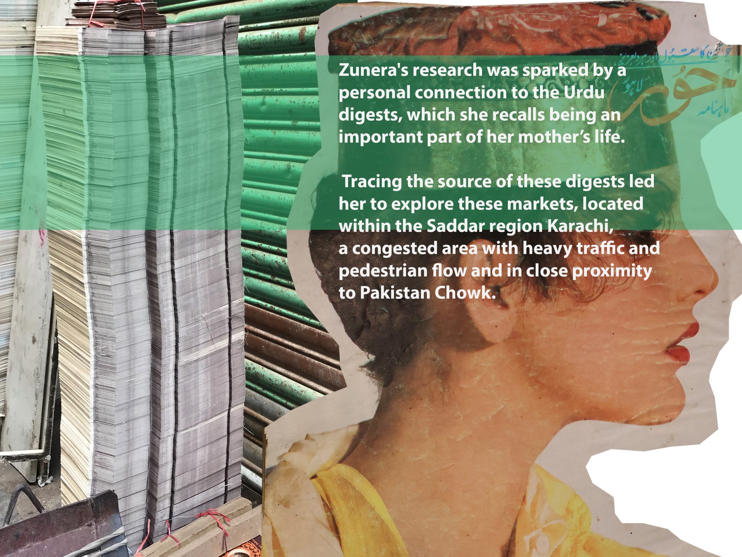 The URA urban craft section is a collaborative effort between alumni from the Department of Fine Art alongside current students. This allows students who are in the process of developing their thesis projects to learn, travel and reflect with graduates who have successfully built hybrid projects that were developed with detailed research and project through their talent and skill. Following Zunera in the alleyways of the Akhbaar Market and Urdu Bazaar, current students and soon to be 2025 alumni, Shezil Ahmed and Komal Rehman outlined aspects of Zunera’s work with her paper resources and printmaking techniques in this video. The PDF is an expanded version developed by the URA team to locate Zunera’s work in the wider context of geography, city planning and materials available in Karachi.